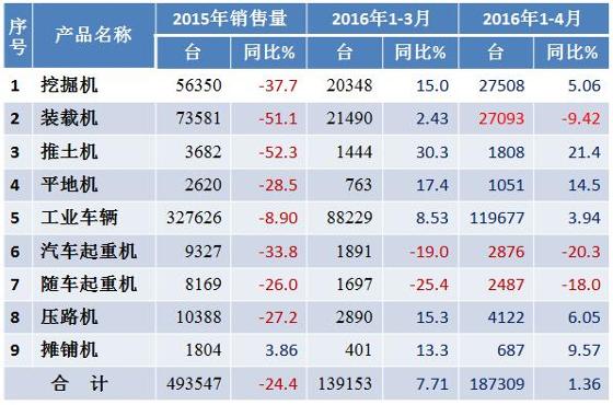 2016年1-4月工程機(jī)械行業(yè)主要產(chǎn)品銷量