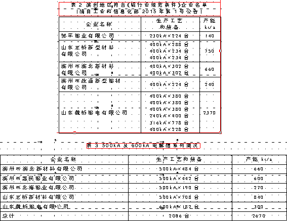 2015年1月4日,工業(yè)和信息化部發(fā)布了符合《鋁行業(yè)規(guī)范條件》企業(yè)名單公告,濱州地區(qū)被列入公告的原鋁生產(chǎn)能力4160kt/a(表2)。2015年魏橋鋁電有限公司還建成了600kA系列電解槽,生產(chǎn)能力300kt/a,交流電耗12500kWh/t鋁,2015年6月5日通過了專家組評審,一致認定:600kA電解槽系列突破了電解鋁容量超大型化的經(jīng)濟性瓶頸,具有產(chǎn)能高、投資省、排放低、效益高等特點,主要技術(shù)經(jīng)濟指標(biāo)達到了國際先進水平。