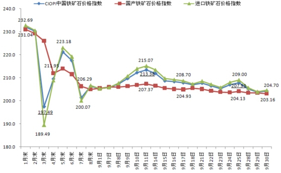 據(jù)中鋼協(xié)監(jiān)測,9月末,中國鐵礦石價格指數(shù)(CIOPI)為204.36點,環(huán)比下降1.89點,降幅為0.92%,環(huán)比由升轉(zhuǎn)降。其中:國產(chǎn)鐵礦石價格指數(shù)為203.16點,環(huán)比繼續(xù)下降1.89點,降幅為0.92%;進(jìn)口鐵礦石價格指數(shù)為204.70點,環(huán)比由升轉(zhuǎn)降,下降1.89點,降幅為0.91%(見表一和圖五)。