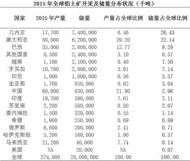 截至2015年底,全球探明鋁土礦儲(chǔ)量為280億噸,幾內(nèi)亞鋁土礦儲(chǔ)量為74億噸;澳大利亞鋁土礦儲(chǔ)量為62億噸,兩國合計(jì)約占全球儲(chǔ)量的50%。