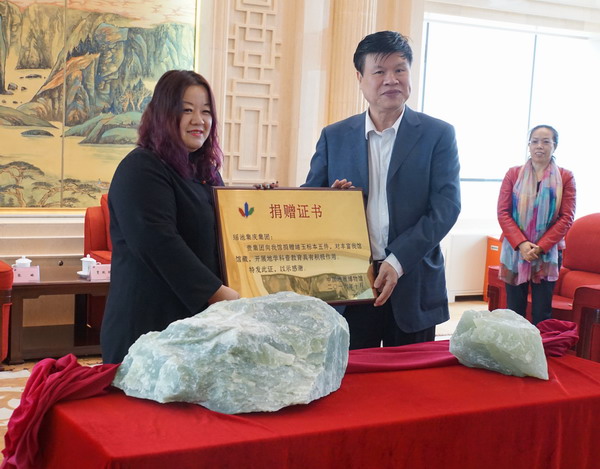 瑤池集慶集團此次共捐贈岫玉原石兩塊、玉雕三件,佩戴首飾一套(3件),其中原石為優(yōu)質(zhì)岫玉礦脈出產(chǎn),玉雕更是經(jīng)過玉雕大師精心打磨。賈躍明館長代表中國地質(zhì)博物館接收贈品并向瑤池集慶集團及玉雕作者頒發(fā)了捐贈證書。