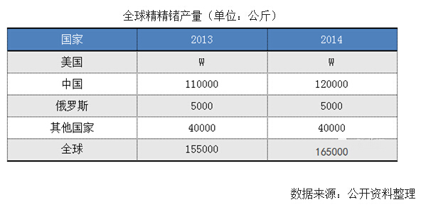 美國地質調查局2015年資料顯示,2013年全球精鍺產量共計155噸,2014年165噸。中國2013年為110噸,2014年120噸,分別占全球總產量的71%和73%。