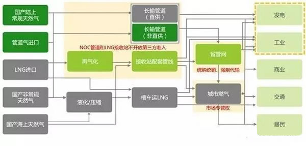 中國天然氣產(chǎn)業(yè)鏈如上圖所示。由于長輸管道和省管網(wǎng)、城市燃氣的壟斷特點,中國天然氣行業(yè)的主要利潤集中于中間環(huán)節(jié)。目前,中國進口天然氣嚴重虧損,頁巖氣、煤制氣、煤層氣等非常規(guī)氣的供應(yīng)成本,在疊加現(xiàn)行的高額管輸、配送成本后,也無法實現(xiàn)盈虧平衡。這直接導(dǎo)致了2014~2016年期間的天然氣需求增速大幅滑落。