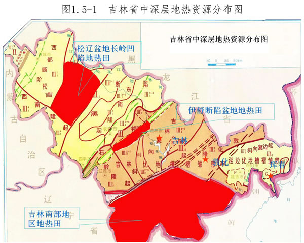 吉林省地?zé)崮苜Y源主要分布在東部長白山天池溫泉群、撫松縣、臨江市等地;中部長春雙陽、四平伊通等地;西部長嶺等地。目前,地?zé)崮荛_發(fā)僅限于溫泉、洗浴和養(yǎng)殖,從長遠(yuǎn)看具有供熱和發(fā)電潛力。此外,在省內(nèi)地表地下水資源豐富地區(qū)以及利用城市污水可以開發(fā)地源熱泵用于供暖制冷。中深層地?zé)豳Y源分布詳見圖1.5-1。