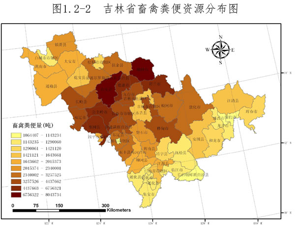 3.畜牧業(yè)生物質(zhì)資源。據(jù)統(tǒng)計,2014年吉林省豬、牛、羊、禽分別發(fā)展到2850萬頭、758萬頭、770萬只和5.68億只,畜禽糞便總量約為8600萬噸/年;其中,牲畜糞便6500萬噸/年,家禽糞便2100萬噸/年。全省畜牧業(yè)規(guī)模化養(yǎng)殖比例約占50%,每年畜禽糞便可能源化利用量約為3456萬噸。隨著畜牧業(yè)和規(guī)?;B(yǎng)殖業(yè)的發(fā)展,預(yù)計“十三五”期間畜禽糞便資源量將以每年1.5%的速度增長。從區(qū)域分布看,全省畜禽糞便資源分布差異大,相對集中分布在長春、白城、四平、松原等中西部地區(qū),詳見圖1.2-2。