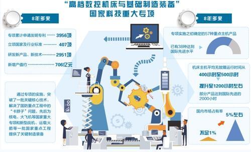 為了夯實我國的工業(yè)之基,縮小我國數(shù)控機(jī)床領(lǐng)域與國際上的差距,2009年,我國正式啟動實施“高檔數(shù)控機(jī)床與基礎(chǔ)制造裝備”國家科技重大專項。8年多來,專項取得了豐碩成果,新增產(chǎn)值約706億元,我國高端數(shù)控機(jī)床技術(shù)水平不斷提高,重點領(lǐng)域國產(chǎn)制造裝備生產(chǎn)制造支撐強勁有力,高檔數(shù)控機(jī)床實現(xiàn)了國產(chǎn)化突圍。