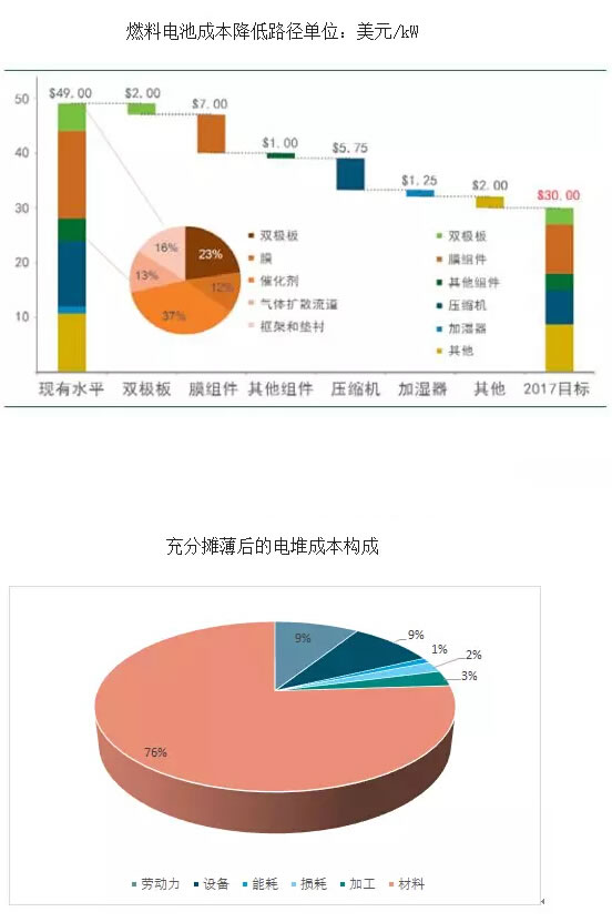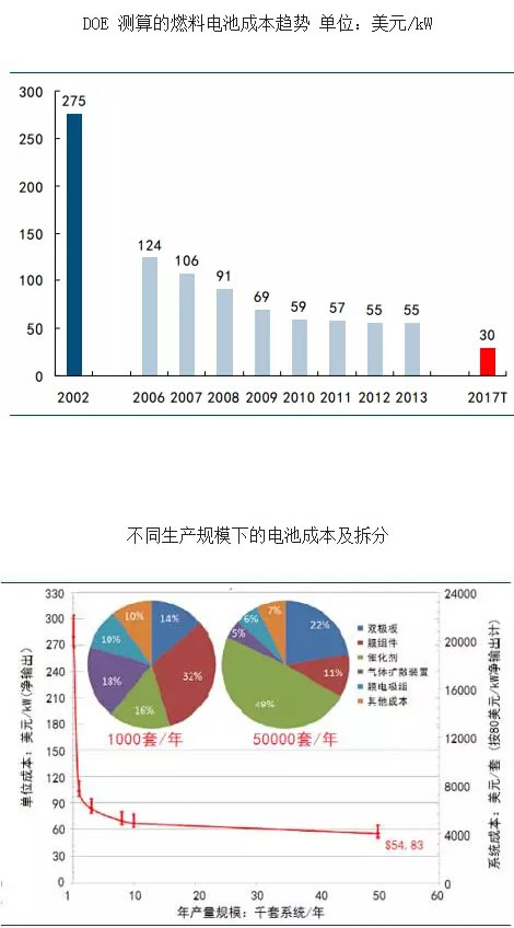 催化劑決定了電池組系成本的主要部分,而對于由電池組及壓縮機(jī)、加濕器及其他配件構(gòu)成的整體燃料電池系統(tǒng)而言,以壓縮機(jī)為主的其他組件同樣尚有成本壓縮空間。從49美元/kW到30美元/kW的成本下降預(yù)期路徑中,電池組和其他組件成本基本各占一半。最后,在量產(chǎn)假設(shè)下的充分?jǐn)偙〕杀緲?gòu)成中,材料以外的成本約占1/4。燃料電池成本的下行依賴從基礎(chǔ)科學(xué)到工程優(yōu)化的系統(tǒng)努力,任重道遠(yuǎn)。
