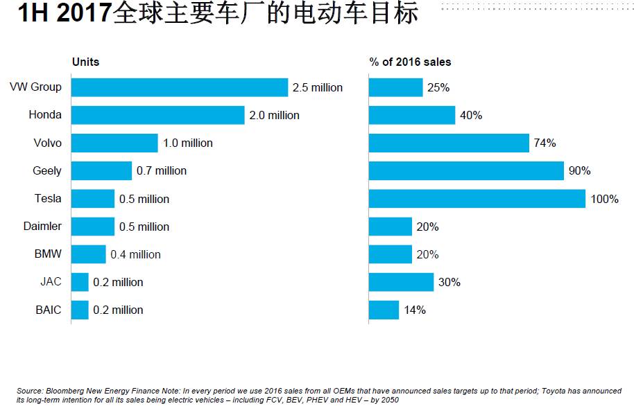 雖然所設(shè)定的達(dá)標(biāo)年限不盡相同(2020到2025不等),全球各主流車企均向外公布了各自在近期和中期的電動車銷售目標(biāo)。