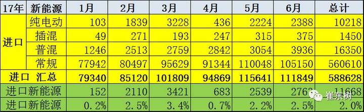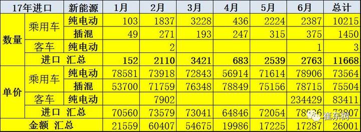 17年1-6月的汽車進(jìn)口達(dá)到59萬臺,其中新能源 車車進(jìn)口11668臺,新能源車占到進(jìn)口總量的2%,且6月占到2.5%。新能源車進(jìn)口表現(xiàn)較強。17年普通混動進(jìn)口16350臺, 高于純電動的進(jìn)口,也就是混動和純電動等的廣義新能源達(dá)到5%左右的進(jìn)口車比例,這也是遠(yuǎn)高于我們預(yù)期的18年實施新能源車的3%的比例的。