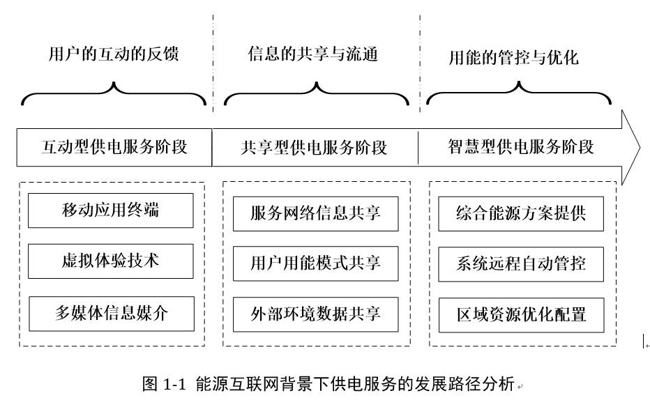 作為電力企業(yè)為用戶提供安全可靠電力的基礎(chǔ)環(huán)節(jié),供電服務(wù)在能源互聯(lián)網(wǎng)背景下的發(fā)展也將呈現(xiàn)出多元化的趨勢(shì),供電服務(wù)也從傳統(tǒng)的單一模式開始走向與用戶的深度對(duì)接,其發(fā)展的趨勢(shì)大致可以分為互動(dòng)型供電服務(wù)、共享型供電服和智慧型供電服務(wù)三個(gè)階段,具體如圖1-1所示: