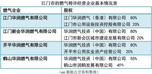 不同于廣州、深圳和佛山三地的燃?xì)馄髽I(yè)由地方國(guó)資主導(dǎo),江門的合資燃?xì)夤局饕扇A潤(rùn)燃?xì)饨^對(duì)控股。