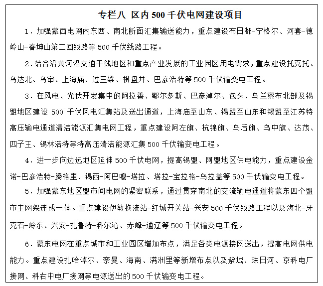 跨境輸電線路。繼續(xù)加大向奧云陶勒蓋、納林蘇海特和扎門烏德等主要城市、重點礦區(qū)和產業(yè)園區(qū)輸電,啟動建設一批500/220千伏變電站及供電線路,推進與蒙古國南部電網實現(xiàn)多點聯(lián)網。完善自治區(qū)邊境地區(qū)電網,支持參與蒙古國電網建設與改造。