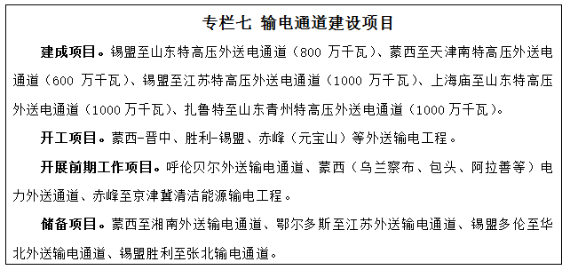 結合全國電力供需整體形勢、電源基地開發(fā)進度等因素,堅持適度超前的原則,采用大容量、遠距離、高效率的特高壓先進輸電技術,加快電力外送通道及配套接網工程建設,進一步提高電力外送規(guī)模?!笆濉逼陂g,建成錫盟-山東、錫盟-江蘇、上海廟-山東、蒙西-天津南、扎魯特-山東青州等特高壓外送電通道。爭取開工建設蒙西-晉中、勝利-錫盟、赤峰(元寶山)等外送輸電工程。結合受端市場情況,積極推進呼倫貝爾、蒙西(烏蘭察布、包頭、阿拉善等)、赤峰-京津冀等電力外送通道論證。力爭到2020年電力外送形成“兩交三直”特高壓、多條超高壓外送通道格局。