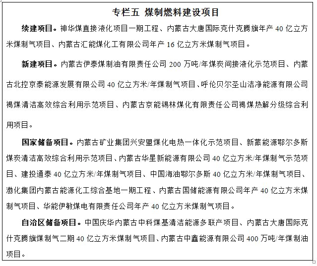 推進煤制燃料升級示范。在現(xiàn)有煤制燃料示范項目的基礎上,按照節(jié)水、環(huán)保、高效的原則,重點在水煤組合條件較好的地區(qū),根據(jù)煤炭資源賦存、水資源和生態(tài)環(huán)境承載能力,按照項目前期工作和建設條件成熟程度,逐步推進煤制油、煤制氣等煤制燃料產業(yè)高標準、高水平升級示范?!笆濉逼陂g,力爭新開工煤制油規(guī)模300萬噸左右、煤制氣規(guī)模120億立方米左右。