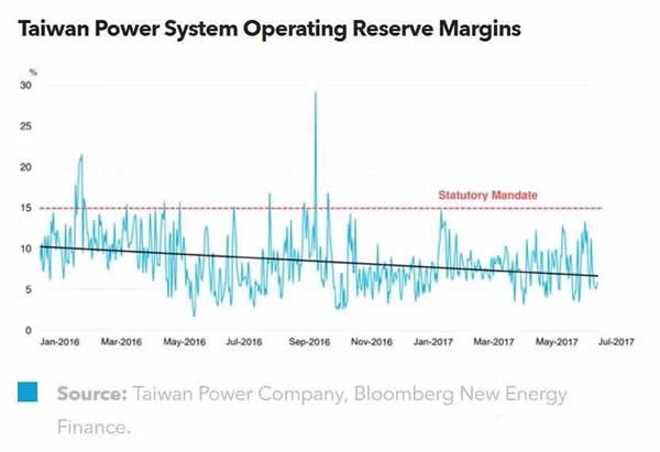 自2010年以來,臺灣的峰值電力需求同比增長2.2%,發(fā)電裝機容量卻下降了1%,這也導致全島備用容量率快速下降。2016年全年,臺灣共有80天的備用容量率跌破6%,遠低于政府規(guī)定的15%。在2014年之前,核電機組的電力產(chǎn)出在臺灣總發(fā)電量中占16.3%。然而,核電技術(shù)的應用一直存在大量爭議。在福島核事故之后,臺灣也已經(jīng)陸續(xù)關閉了3座核電機組(全島共有6座)。