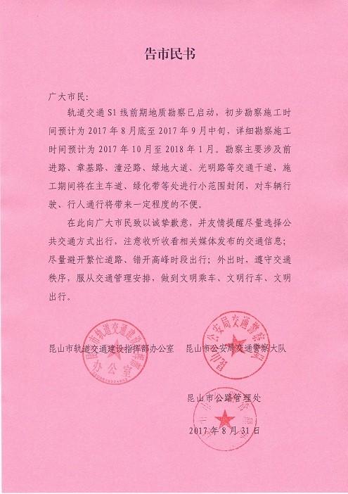昆山市軌道交通建設(shè)指揮部辦公室聯(lián)合昆山市公安局交通警察大隊、昆山市公路管理處,于2017年8月31日特發(fā)布《告市民書》