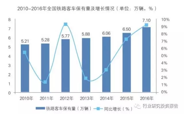 從鐵路客車保有量來(lái)看,2016年全國(guó)鐵路客車擁有量為7.1萬(wàn)輛,比上年末增加0.3萬(wàn)輛;其中,動(dòng)車組2586標(biāo)準(zhǔn)組、20688輛,比上年增加380標(biāo)準(zhǔn)組、3040輛。