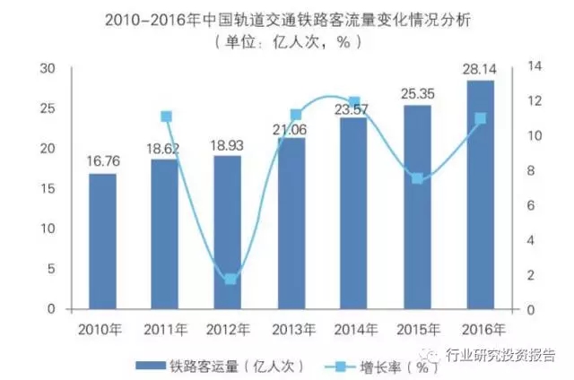 從近五年我國(guó)鐵路旅客發(fā)送量可以看出,整體上呈逐年上升趨勢(shì),2016年的旅客發(fā)送量達(dá)到28.14億人次,同比增長(zhǎng)11.01%。