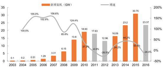 2003-2016 年國(guó)內(nèi)風(fēng)電新增裝機(jī)情況