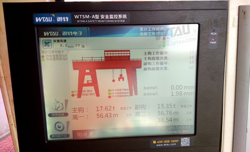 微特電子門機安全監(jiān)控系統(tǒng),對門機運行工況進行實時采集,實時記錄。進行數(shù)據(jù)核算比對,顯示畫面比傳統(tǒng)儀表更直觀、更友好。在門機運行接近限定值、規(guī)定值,系統(tǒng)將對司機做出提醒,在到達限定值時將警告司機,并停止司機的危險操作。