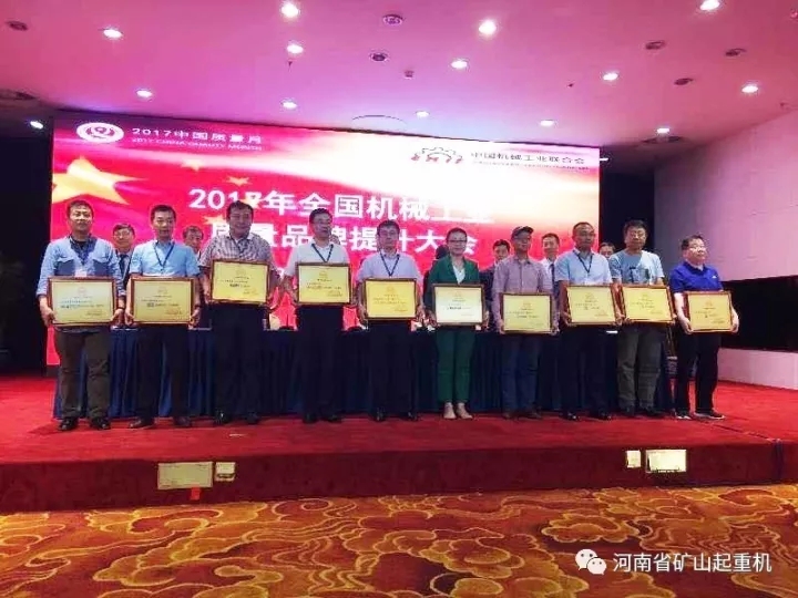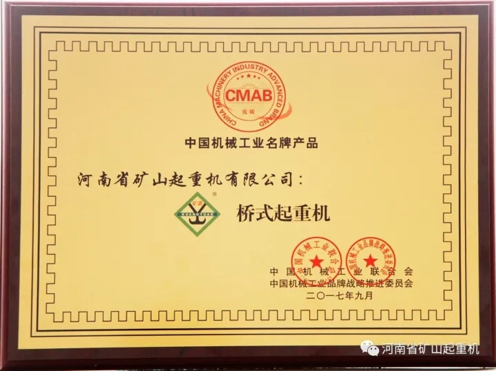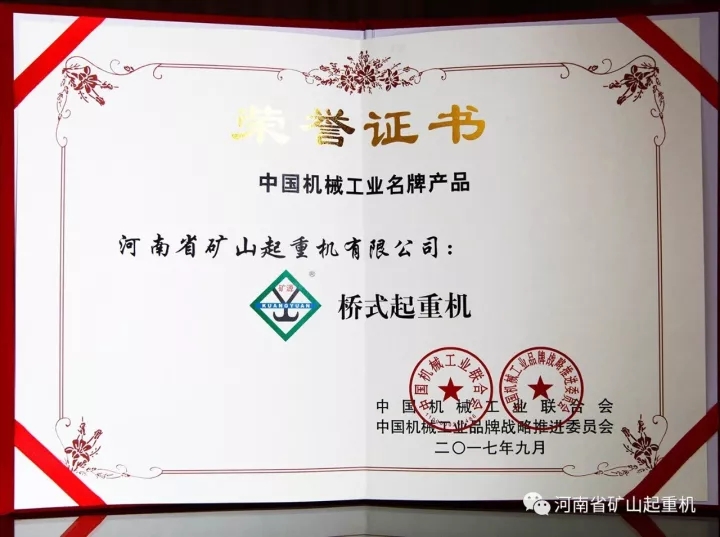 2017年9月26日,中國機械工業(yè)聯(lián)合會授予河南省礦山起重機有限公司“礦源牌橋式起重機”為“中國機械工業(yè)名牌產(chǎn)品”。