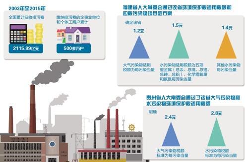 在環(huán)保稅法出臺后,各省份陸續(xù)草擬適用稅額和應(yīng)稅污染物項(xiàng)目數(shù)方案,并向社會(huì)征求意見。9月29日,福建省人大常委會(huì)通過該省環(huán)境保護(hù)稅適用稅額和應(yīng)稅污染物項(xiàng)目數(shù)方案,確定該省大氣污染物適用稅額為每污染當(dāng)量1.2元;水污染物適用稅額為五項(xiàng)重金屬(總汞、總鎘、總鉻、總砷、總鉛)、化學(xué)需氧量和氨氮每污染當(dāng)量1.5元,其他水污染物每污染當(dāng)量1.4元。