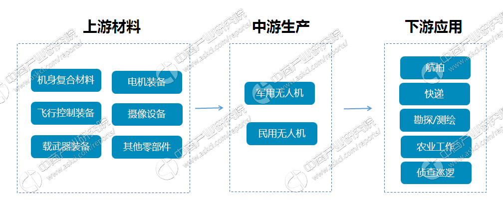 在無人機產(chǎn)業(yè)鏈中中,上游主要是各種制造無人機的材料,有機身復合材料、電機裝備、飛行控制裝備、攝像設備等;下游為各類民間、商業(yè)、軍工應用領域,包括航拍、快遞、勘探、測繪以及偵查巡邏等。