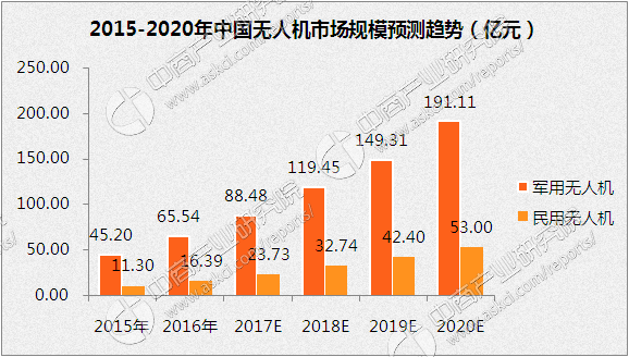 根據(jù)中商產(chǎn)業(yè)研究院發(fā)布的《2017-2022年中國無人機市場發(fā)展前景及投資機會分析報告》數(shù)據(jù)顯示,2015年中國民用無人機市場銷售規(guī)模達到11.3億元。隨著無人機應用領域的逐漸擴大,無人機市場需求逐漸提升,預計2017年中國民用無人機市場規(guī)模將達到23.73億元。2017年中國軍用無人機市場規(guī)模將達到88.48億元,未來將保持持續(xù)穩(wěn)定增長。預計到2020年中國民用無人機市場將達53億元,軍用無人機將達191.11億元,中國無人機市場總規(guī)模將超200億元。
