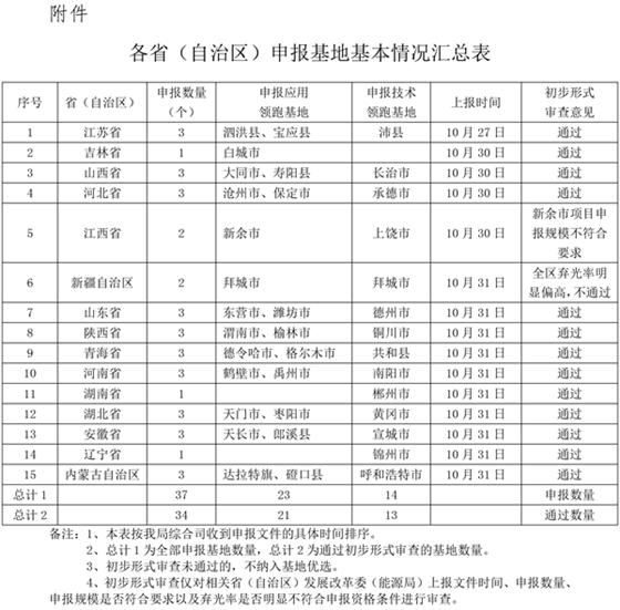 現(xiàn)我局按截止時(shí)間對(duì)相關(guān)省(自治區(qū))發(fā)展改革委(能源局)申報(bào)文件進(jìn)行了統(tǒng)計(jì)和初步形式審查。截至10月31日,共有15個(gè)省(自治區(qū))向我局正式提交了共37個(gè)光伏發(fā)電領(lǐng)跑基地申報(bào)材料,其中包含23個(gè)應(yīng)用領(lǐng)跑基地和14個(gè)技術(shù)領(lǐng)跑基地;共有14個(gè)?。ㄗ灾螀^(qū))的34個(gè)光伏發(fā)電領(lǐng)跑基地通過(guò)了初步形式審查,其中包含21個(gè)應(yīng)用領(lǐng)跑基地和13個(gè)技術(shù)領(lǐng)跑基地。為保障領(lǐng)跑基地優(yōu)選工作公平、公正、公開(kāi),現(xiàn)按類別對(duì)申報(bào)基地的基本情況予以公開(kāi)。