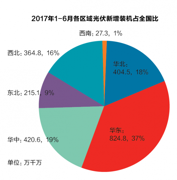 同時(shí),光伏開發(fā)布局由西北地區(qū)向中東部地區(qū)轉(zhuǎn)移的趨勢(shì)更加明顯。1-6月,華東地區(qū)新增裝機(jī)為825萬千瓦,同比增加1.5倍,占全國(guó)的34%,其中浙江、江蘇和安徽三省新增裝機(jī)均超過200萬千瓦。華中地區(qū)新增裝機(jī)423萬千瓦,同比增加37%,占全國(guó)的17.3%。西北地區(qū)新增裝機(jī)為416萬千瓦,同比下降50%。