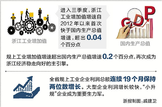 金秋收獲季,浙江工業(yè)經(jīng)濟(jì)畫(huà)出一道漂亮的上揚(yáng)線,呈現(xiàn)明顯好于去年同期、明顯好于全國(guó)平均水平、明顯好于主要工業(yè)強(qiáng)省的積極態(tài)勢(shì)。進(jìn)入三季度,浙江工業(yè)增加值增速自2012年以來(lái)首次快于國(guó)內(nèi)生產(chǎn)總值增速,超出0.04個(gè)百分點(diǎn),且規(guī)模以上工業(yè)增加值增速超出國(guó)內(nèi)生產(chǎn)總值增速0.2個(gè)百分點(diǎn),再次成為浙江經(jīng)濟(jì)穩(wěn)走向好的主引擎。
