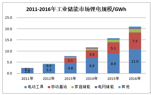 工業(yè)儲能市場的發(fā)展目前還主要依賴于電動工具和移動基站電源這兩個細(xì)分市場。圖表4顯示,電動工具市場的占比2011年以來逐年下降:2011年電動工具市場以2.0GWh占比83.2%,到2016年以11.0GWh占比52.0%。不過,電動工具市場鋰離子電池已基本完成了對鎳鎘電池等其他二次電池的替代,以后的市場增長空間將非常有限。移動基站電源市場2013年開始快速發(fā)展,到2016年以7.3GWh占比34.8%,這與中國電動汽車市場的爆發(fā)基本同步,不少汽車電池次品在這個市場實(shí)現(xiàn)了應(yīng)用。