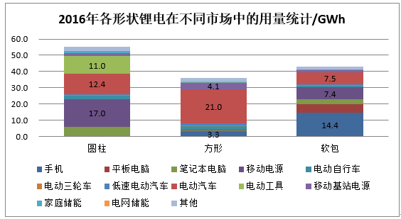 圓柱電池和軟包電池的使用情況相對要分散一些,第一位細(xì)分市場的占比不是那么突出,但也都在30%以上。2016年55.1GWh的圓柱電池總用量中,移動電源(充電寶)市場以17.0GWh占比30.8%排在第一位,電動汽車市場以12.4GWh占比22.5%排在第二位,電動工具市場以11.0GWh占比19.9%排在第三位(該市場使用的鋰離子電池全部是圓柱電池)。