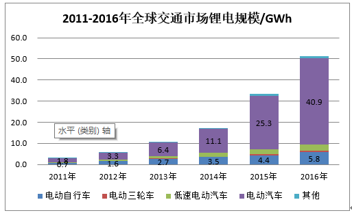 圖表3:2011-2016年全球交通市場鋰電規(guī)模統(tǒng)計(數(shù)據(jù)來源:真鋰研究)