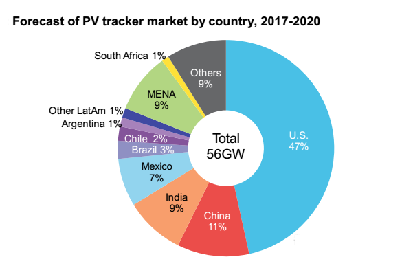 近期,彭博社新能源金融報告對全球太陽能跟蹤支架市場做出了市場預(yù)期,報告指出太陽能跟蹤支架前景一片光明,預(yù)計2017年至2020年,太陽能跟蹤支架出貨量可達到56GW,市場主要集中在美國,中國印度次之。