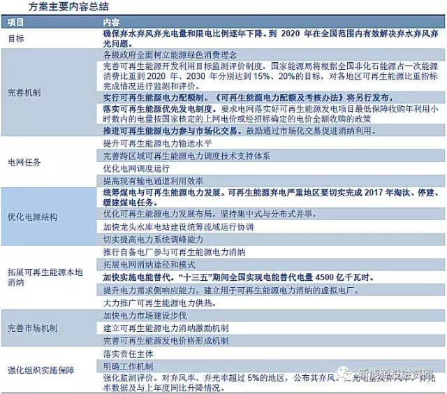 11月13日,國家發(fā)改委、能源局正式印發(fā)《解決棄水棄風(fēng)棄光問題實施方案》,明確按年度實施可再生能源電力配額制,并在2020年全國范圍內(nèi)有效解決棄水棄風(fēng)棄光問題。具體內(nèi)容總結(jié)見下表: