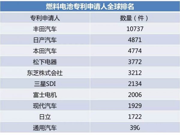 根據(jù)上海科技情報(bào)研究所對燃料電池相關(guān)專利的檢索分析,燃料電池專利申請人全球排名中,日本豐田汽車以10,737個專利族居首,大幅領(lǐng)先競爭對手。在前十名的企業(yè)中,7家為日本企業(yè)。各企業(yè)掌握的專利數(shù)量差距較大,技術(shù)主要集中在排名前五的大公司手中。