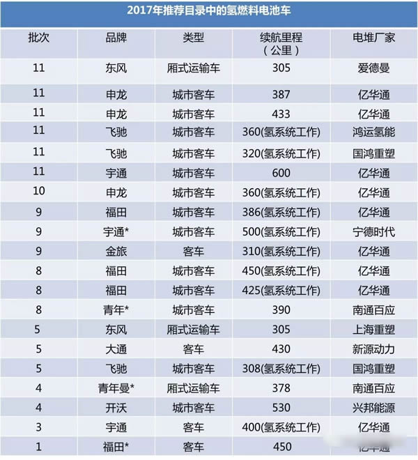 2017年12月初,工信部公布了第11批新能源汽車推薦目錄。今年以來,全國已有217家企業(yè)的3113個車型進(jìn)入目錄。在這其中,共有20款氫燃料電池入選,占全部車型的千分之六。車型以客車為主,共17輛,另有3輛為廂式運(yùn)輸車。品牌分布較為均勻,其中北汽福田有4款福田牌客車入選,上海申龍、佛山飛馳、宇通客車各有3款入選。