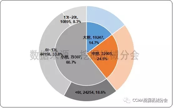 2017年國(guó)內(nèi)大挖、中挖、小挖銷量分別為19247、32005、和79307臺(tái),市場(chǎng)份額分別為14.7%、24.5%和60.7%。小于6噸的微型挖掘機(jī)和6~13噸的小型挖掘機(jī)占據(jù)國(guó)內(nèi)超過(guò)一半的市場(chǎng)份額。