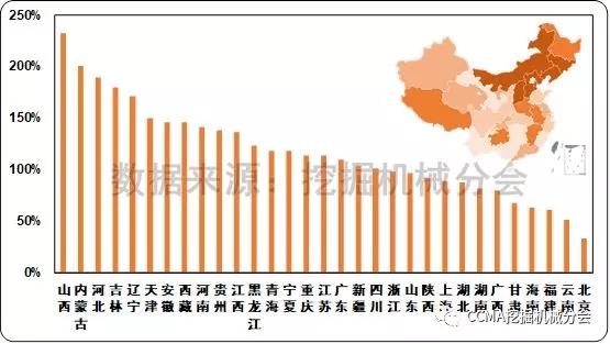圖10 2017年國(guó)內(nèi)挖掘機(jī)械市場(chǎng)各省份銷量同比變化情況