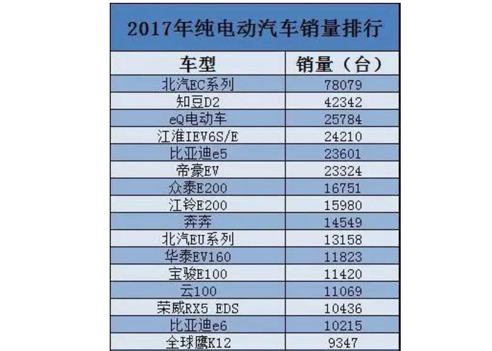 目前,A00級電動車仍是新能源汽車市場主銷車型。據(jù)乘聯(lián)會數(shù)據(jù)顯示,2017年12月新能源汽車共銷售9.8萬輛,其中A00級車型超過5萬輛,同比增長182%,占據(jù)61%的市場份額。在2017年純電動汽車銷量排行榜前十名中,主要為北汽EC180、知豆D2、奇瑞eQ電動車、眾泰E200、奔奔等7款A(yù)00級車型占據(jù)。