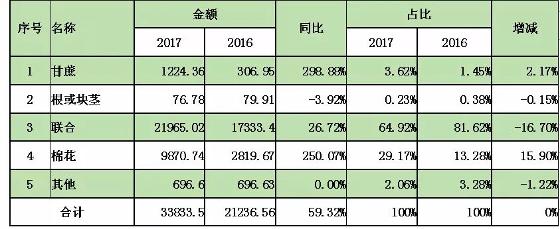 值得注意的是,根莖或塊莖和棉花收獲機(jī)出口量和出口額均出現(xiàn)不同程度的攀升,海關(guān)統(tǒng)計(jì)顯示,截至2017年11月底,進(jìn)口量分別為131臺(tái)和47臺(tái),同比分別增長(zhǎng)2.34%和291.67%;實(shí)現(xiàn)進(jìn)口額分別為1619.38萬(wàn)美元和2194.02萬(wàn)美元,同比分別大幅度攀升29.56%和280.43%。