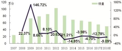 2007~2016年收獲機(jī)械銷(xiāo)售走勢(shì)與2017年2018年市場(chǎng)預(yù)測(cè)