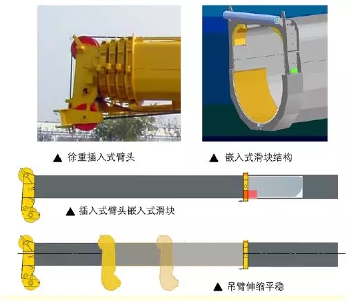 插入式臂頭設(shè)計(jì),曾獲得國(guó)家專(zhuān)利設(shè)計(jì),也是當(dāng)時(shí)行業(yè)唯一一個(gè)成熟應(yīng)用該技術(shù)的企業(yè),加長(zhǎng)的嵌入式條形滑塊,支撐面積大,降低對(duì)內(nèi)節(jié)臂筒體的接觸應(yīng)力,吊臂承載力更強(qiáng)。