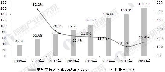 2009-2016年城軌交通客運量總規(guī)模趨勢圖(單位:億人,%)