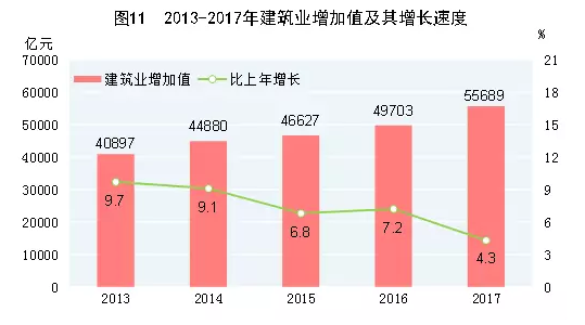 國家統(tǒng)計(jì)局2月28日發(fā)布了《2017年國民經(jīng)濟(jì)和社會(huì)發(fā)展統(tǒng)計(jì)公報(bào)》。數(shù)據(jù)顯示,2017年國內(nèi)生產(chǎn)總值827122億元,比上年增長6.9%,保持穩(wěn)定增速。其中建筑業(yè)總產(chǎn)值達(dá)213954億元,同比增長10.5%。但增加值55689億元,比上年增長4.3%,增長率較2016年有所下降。這也印證了基建通之前發(fā)布的預(yù)測:《市場不是永遠(yuǎn)吃不飽的貪吃蛇:建筑業(yè)市場需求總量的臨界點(diǎn)正在到來,2018不會(huì)有更高的總量!》。