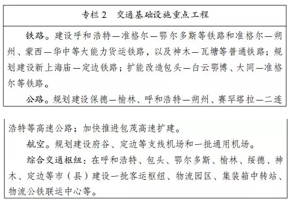 暢通對外陸路交通通道。有序推進京包(頭)、包(頭)銀(川)、 包(頭)西(安)等鐵路建設(shè),改造提升包茂高速、榮烏高速、青銀高速以及國省干道,暢通通往二連浩特、滿都拉等邊境口岸和秦皇島、曹妃甸、黃驊港等沿海港口的公鐵、鐵海聯(lián)運通道,重點建設(shè)大能力貨運鐵路和重載公路,改造繁忙干線、主要樞紐及客貨站場,促進與京津冀、關(guān)中平原、寧夏沿黃、山西中部等城市群緊密聯(lián)接。