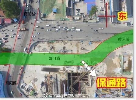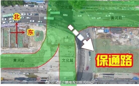 鄭州黃河路與因地鐵5號(hào)線文化路站施工需要,自2018年04月26日晚間起,文化路黃河路交叉口以西保通路向南平移,交叉口以南保通路向西平移,四個(gè)方向車輛將沿新建保通路通行,保通路與現(xiàn)有路面寬度一致。