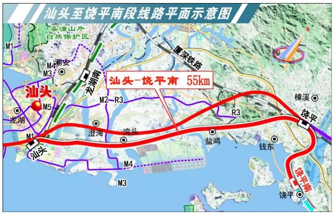 第一階段(“十三五“期間)實施“一線”之汕頭-汕尾和“內(nèi)環(huán)”汕頭-潮州東-潮汕-潮汕機場-汕頭,計 258km;總投資 523 億元。