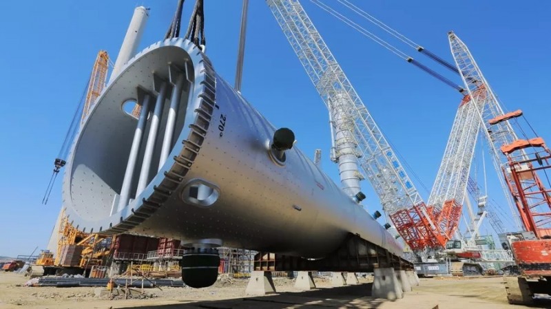 ▲即將被吊的龐然大物:凈重達1308噸的石化反應器